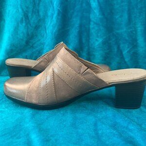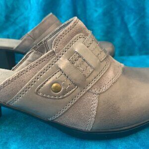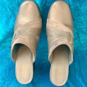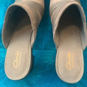 Clarks gray leather mules Womens SZ 11 - NEW - slip on shoes 2.5 inch heel