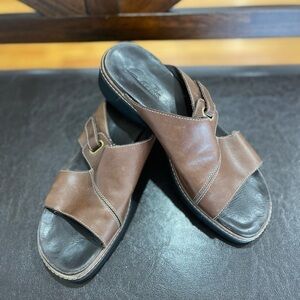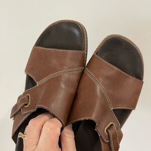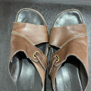 Clark’s brown leather sandals slide in slip on with adjustability in a size 9 1/2 N