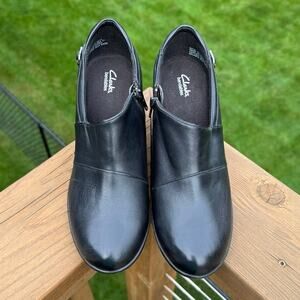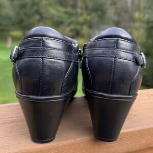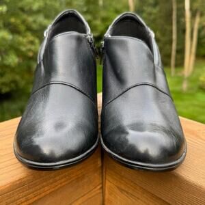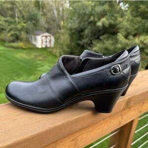 Clarks size 10 Bendables Black Leather Heeled Booties Shooties Buckle Accent