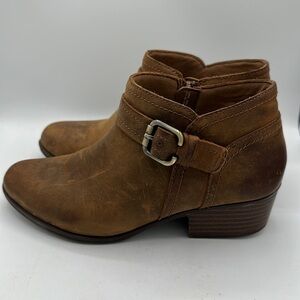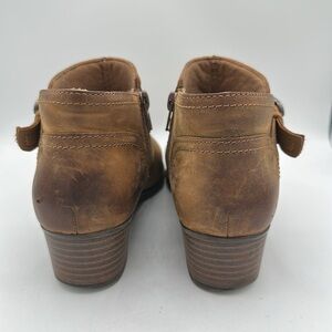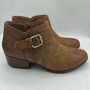 Clarks tan / brown ankle booties, size 6M. Intentionally rustic look. Generally good preowned condition. Some wear at outer heels and a small nick on left back. Inside zippers for ease in getting feet in and out. Goldish buckle on outer edge.