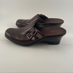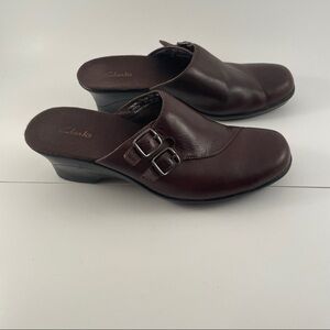 Clarks wedges, mule, brown, soft leather and super comfy! Size 7 Great for an everyday shoe! In excellent preloved condition, with a ton of life left!