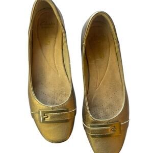 Clarks women’s gold size 10 cushion ballet flats with 1/2 inch heel, buckle toe
