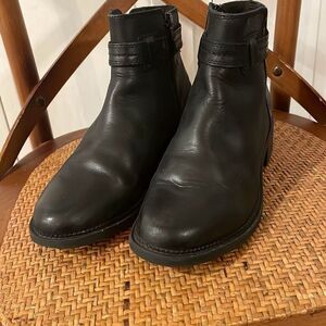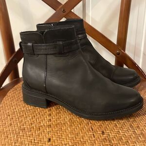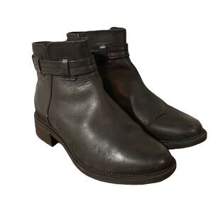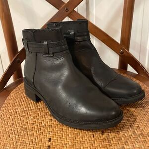 Clark’s collection beautiful leather black rounded toe boot with side zipper and strap detail. Small 1” block heel. Light wear to leather overall great shape maybe worn once see photos!