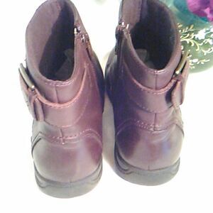 Beautifully constructed low boots. Warm chocolate brown. Tucks and stitching on the front. Decorative buckle wraps around the back. Inside zip Comfort sole, soft lining, padded footbed.Sixe 7.5 measures 101/4 long,