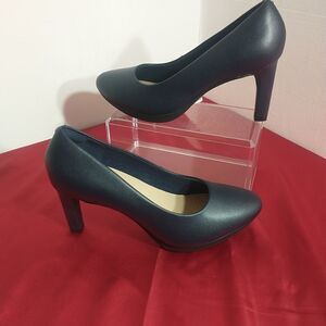 Clarks Pump Heels Womens 8.5M Blue Ambyr Joy Slip On Faux Leather Almond Toe.