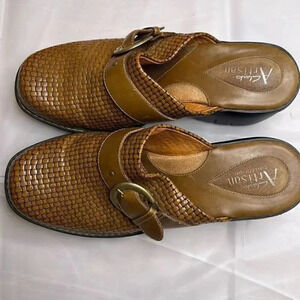 In excellent preowned condition these tan leather clogs are very comfortable. Heels are about 2 inches. BE1