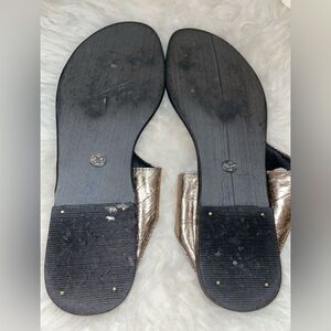 Flat bronze metallic leather thong sandals with leather soles.