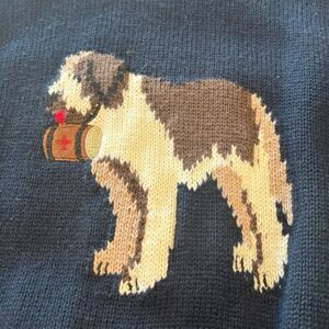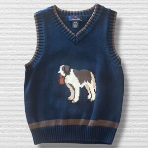 Classic boys sweater vest by Class Club (sold at Dillards), size 4/5. Navy blue with brown trim at neckline, armholes, and hem. Features an intarsia knit design of a St. Bernard dog with a rescue barrel a standout preppy novelty style. Made from 100% cotton for comfort and easy wear.