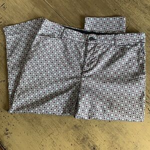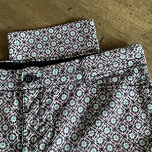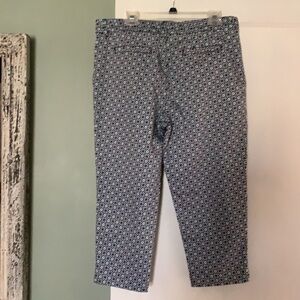 KHAKIS & COMPANY offers simple chic designs. These capris are in a navy/white/teal medallion print and feature side slits at cuffs. Banded elastic waist on the inside, the exterior features belt loops. Dual button closure with zip fly. 2 back pockets still sewn shut, and 2 front pockets. 98% Cotton, 2% Spandex. Machine wash, tumble dry. Worn a couple of times and in excellent condition. Measures approximately: 17 1/2” across waist, 33” outseam, 22 1/4” inseam, 11” rise.