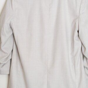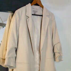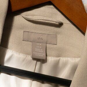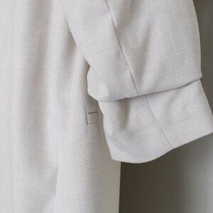 Timeless and versatile beige blazer with a longline cut. Features notched lapels, open front, and lightweight fabric. Perfect for workwear, layering, or a chic casual outfit. Neutral tone makes it easy to style year-round. Great pre-owned condition.