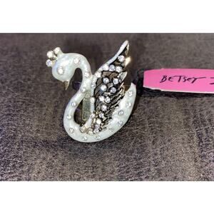 The Classic Betsy Johnson Swan Ring is a stunning statement piece that features a silver tone metal base with rhinestone detailing. This retired piece exudes elegance and style, making it a perfect accessory for any outfit. Betsey Johnson's signature swan design adds a touch of glamour to this eye-catching ring, making it a must-have for any jewelry collection.