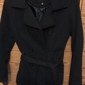 Elevate your style with this classic black women's peacoat. Perfect for any occasion, this coat offers both warmth and elegance.