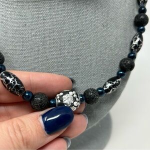 Classic Black Lava Rock Beaded Necklace with Blue and Black Marble Beads with Main White Floral Bead