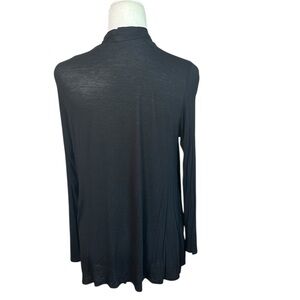 This black cardigan features a flowing open front with an asymmetrical hemline, crafted from lightweight material for effortless draping and movement. Its versatile design makes it an ideal layering piece for any occasion.