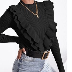 Classic Black Ribbed Fitted Ruffle Detail Long Sleeve Sweater