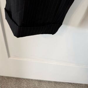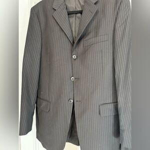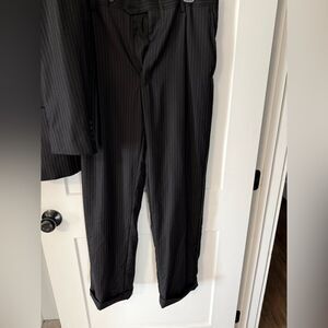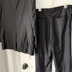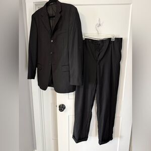 This black suit features a single-breasted jacket with notched lapels and matching trousers, crafted from a subtly textured fabric. Ideal for formal occasions, it offers a timeless and sophisticated look.