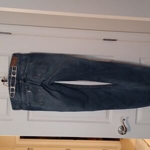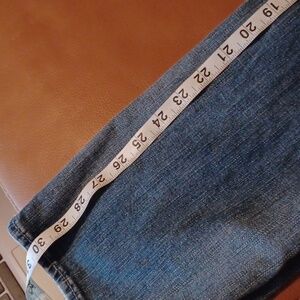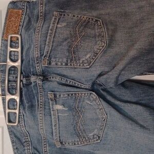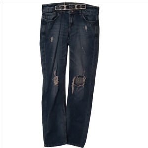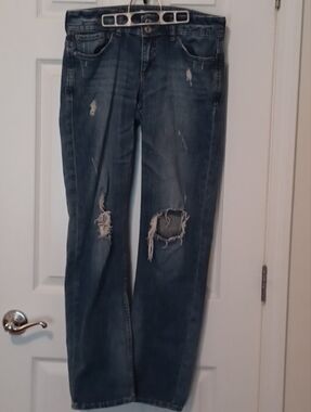 Elevate your style with these classic blue distressed jeans. Perfect for a casual day out.