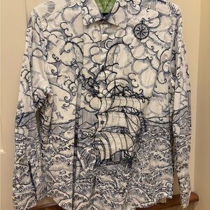 Stylish Classic shirt with intricate blue patterns on a white background. Comfortable fit. Worn only a few times has been to the dry cleaner once. Robert Graham. 2xl