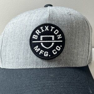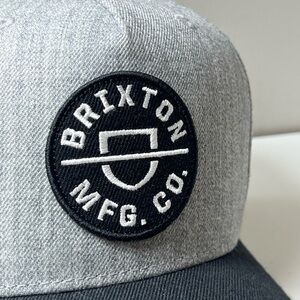 Stylish Brixton trucker hat. Features a black front with gray mesh back. Embroidered logo on the front.
