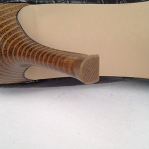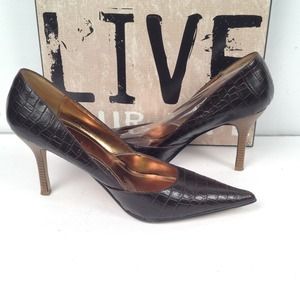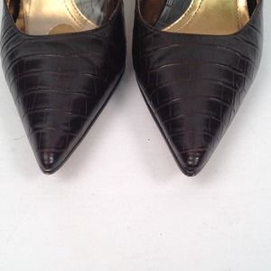 Pointy toe brown croc pumps with stiletto heel. Great with pencil skirts or jeans! Never worn. Sole scuffed a little from trying on but heel is in perfect new condition as shown in photo!