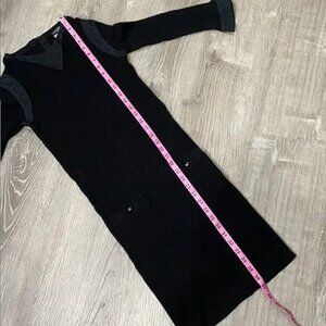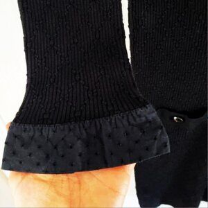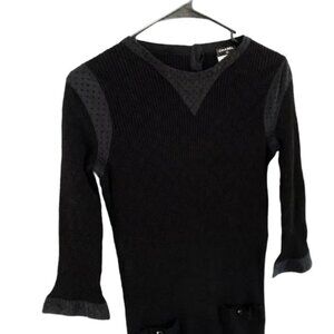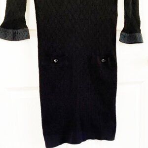 This gorgeous Chanel dress is so stretchy that it's more like a medium, I'm a size small it's almost too large for me but if you prefer your dress loose then it's good, but it's a very chic and classy dress two tones of black make it more contemporary feeling. some of the photos show pinkish on the dress but it's just the lighting and the dress is all black with the lighter black trims. two front pockets have the double CC Chanel logo on the buttons.