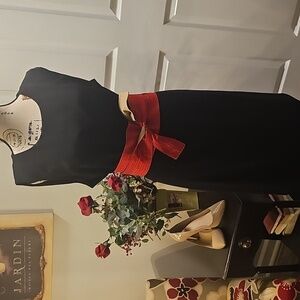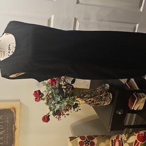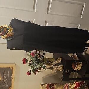 Chic black midi dress by Calvin Klein. Sleeveless design with a sleek silhouette. Ideal for formal or casual events. i've given all kinds of ideas how to wear it with jewelry , a cinched belt, a scarf-like turtleneck. notice I paired black tan and even beaded yellow/black Vince Camuto heels