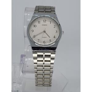 Description: Elevate your everyday style with this classic Casio quartz watch. Featuring a sleek stainless steel case and bracelet, this timepiece boasts a clean, minimalist white dial with easy-to-read black numerals. Designed for reliability and timeless appeal, it’s the perfect blend of functionality and sophistication. Whether you're dressing up or keeping it casual, this versatile watch is ready to complement any outfit. A durable and dependable choice for those who appreciate simple elegance.
