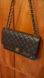Chic Chanel shoulder bag in black quilted leather. Features elegant gold-tone chain strap and iconic logo clasp. Perfect for any occasion.