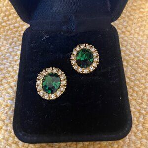 Gorgeous faceted emerald green and clear crystal goldtone oval shaped earrings - pierced/stud style, perfect for holidays