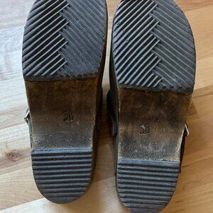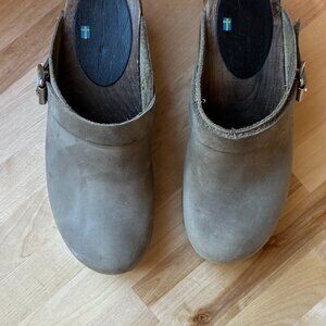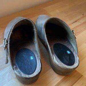 These Lotta From Stockholm Women's clogs are crafted with love and care in Sweden using Italian vegetable tanned oiled nubuck leather for the uppers and seasoned Swedish Alder from managed forests for the base. A 5cm (2 inch) heel with 2cm (0.75 inches) platform provides enough height to allow the properly shaped footbed to be formed which includes both a pronounced arch support and a big toe indent for easier walking.