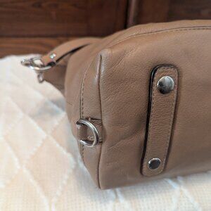Classic Coach Leather Satchel Handbag. Beautiful tan leather handbag with zippered top and 3 interior compartments with one being zippered. Looks fabulous with casual wear or dressed up! Height 9 inches X Width 13 inches X 4 1/2" deep.