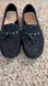 Classic black loafers with tie lace detail. Comfortable and stylish for any occasion. See pics-paired with Nike for extra support. Shoes are structurally sturdy. No holes, no tears. See pictures for some marks on the suede.