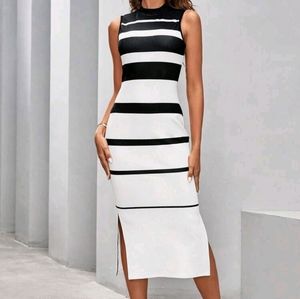 Classic Cowl Neck Stripe Color Block Sleeveless Slit Tank Top Dress Black White