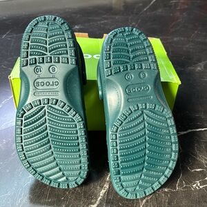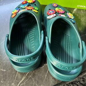 Worn once and then cleaned are these Classic Crocs in the color of evergreen. The shoes will ship with the charms. Please, ask questions. Thank you.😊
