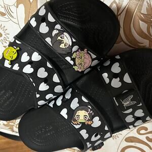 heart print, kawaii style, casual sandals, black and white, comfortable footwear, cute design, summer shoes, everyday wear, playful pattern, versatile style