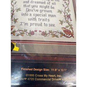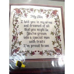 This cross stitch kit offers a meaningful project with a heartfelt message for a son, featuring a traditional design. It includes everything necessary for completion, such as pre-sorted carded floss, fabric, and a tapestry needle. The finished piece measures 11.9" x 12.1", perfect for display as a cherished keepsake. Never worked