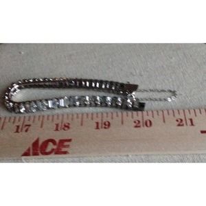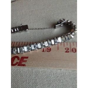 This is an interesting and elegant tennis bracelet signed by Krementz. The rhinestone shapes alternate between marquise and emerald cut as it circles the wrist. The contrasting shapes bring in a lot of reflected light and make this bracelet really sparkle. I believe the setting is rhodium. There's a working safety chain and clasp. It's in wonderful condition with all the stones present. The pictures make the bracelet look blue but it's actually clear with no yellowing. -- Closed, the bracelet is approximate 7.25" long and has a 2" safety chain. It's .50" wide.