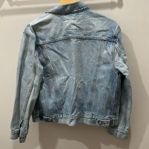 Stylish light blue denim jacket. Features button closure and front pockets.