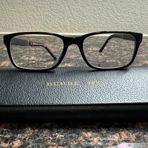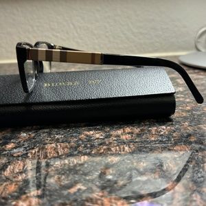 The glasses in the image have a classic rectangular frame design, which is a versatile style suitable for various face shapes. The frame is primarily black, which suggests a sense of sophistication and could easily complement most attire choices. The temples of the glasses have a distinctive design featuring what appears to be the iconic Burberry check pattern in a subtle, beige, black, and red color scheme, which adds an element of designer appeal and brand recognition.