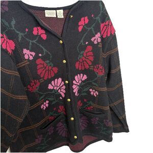 Classic Elements Black Brown Pink Floral Heavy Cardigan Sweater Size 1X women's. In good condition. 100 % acrylic. Gold buttons. Pockets. Red, Pink and Purple Flowers.