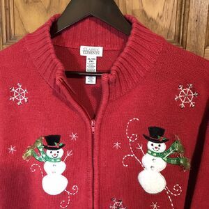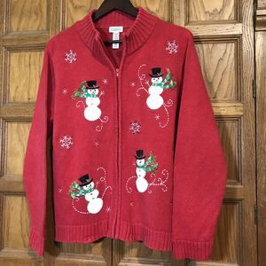 Classic Elements Christmas Snowman Sweater Women's XL Red Ramie Cotton Full Zip