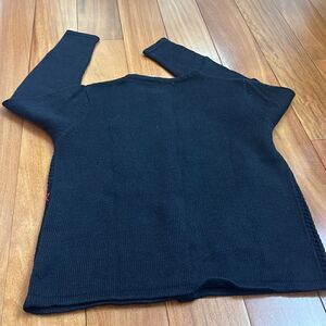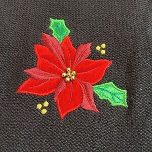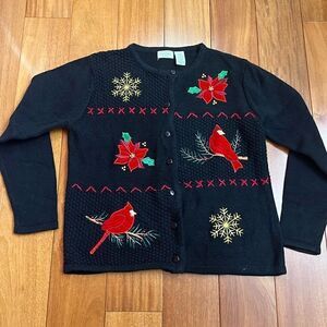 This vintage 90s/Y2K Classic Elements cardigan sweater is a size MP. It’s black with red cardinals and poinsettias. It has buttons down the front. It’s a cotton/ramie blend and is perfect for the upcoming holiday season. It’s in good vintage condition.