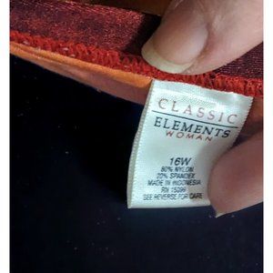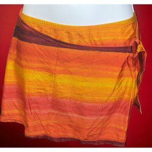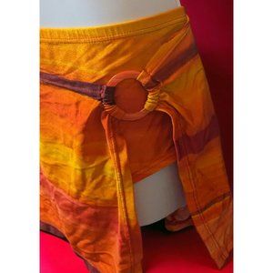 Super cute bikini bottom with attached skirt by Classic Elements Woman. It's new without tags. It's in a beautiful sunset print in tones of yellow, orange, and red. It has classic bikini style bottoms with an attached skirt. The back of the skirt waist is affixed completely to the back of the bikini bottoms waist, while the front is only attached at the sides, giving it a sarong style look. It attaches with a pinkish orange ring on the left hip, the the left side of the skirt is open so the thigh shows through.