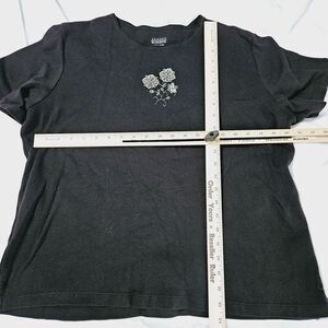 Classic Elements Womens T-Shirt in black, size XL. Made from 100% cotton, this short sleeve pullover offers comfort and style with a solid pattern and flower design.