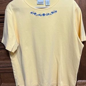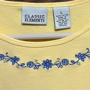 Classic Elements yellow shirt with blue flowers along neckline, size Large