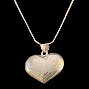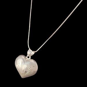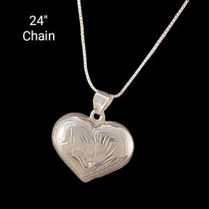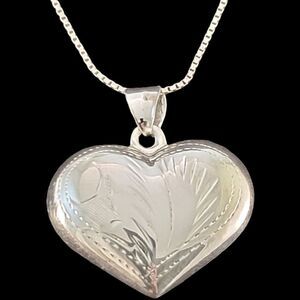 Vintage classic engraved sterling silver puffy heart pendant on a 24" chain.