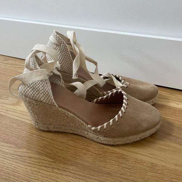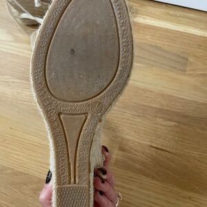 Classic espadrilles with ribbon ties for your ankles. Cute detailing of white and brown with rope style heel. Easy to walk in, very comfortable. Only worn a handful of times! Lots of life left in them. One ribbon is starting to fray.