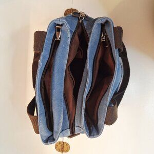 Medium blue bag body with brown zippers, lining, and straps. All hardware is silver colored