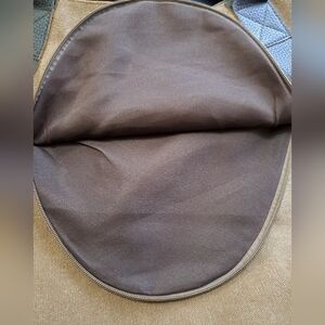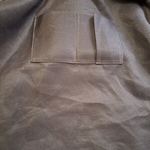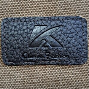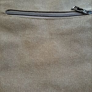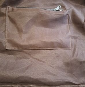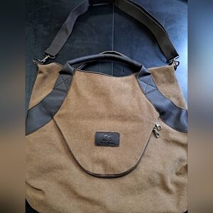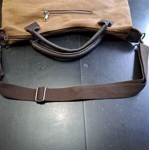 new condition, tan & brown, outside has a flap that unzips for storage, the back side also has a storage compartment, large open space with two open pouches on one side & two zippered compartments on the other, leather handles & trim, large carry on strap, strong & durable canvas, zipper closure on top