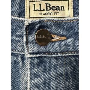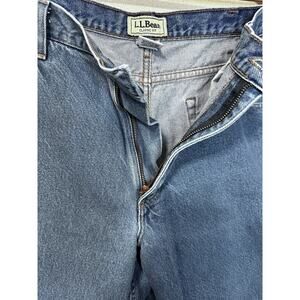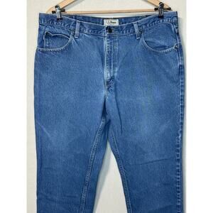 This is a pair of L.L. Bean men's jeans in size 40 waist and 29 inseam. The jeans feature a classic fit with a straight leg design, made from medium wash blue denim fabric. They have a zip and button closure, 5-pocket design, and are machine washable. The brand logo accents the garment, and it is suitable for all seasons. Perfect for a timeless and versatile addition to any wardrobe.